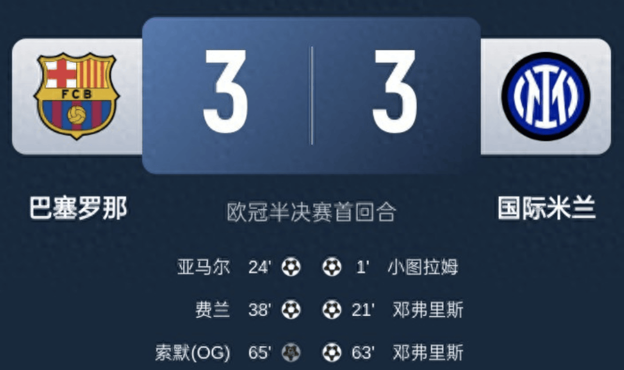 北京时间3:00,欧冠半决赛首回合巴塞罗那vs国际米兰,比赛在奥林匹克体育场打响!上半场,邓弗里斯传中,小图拉姆开场30秒脚后跟闪击破门!随后角球中邓弗里斯侧钩破门!亚马尔个人能力1v5兜射破门!随后又击中横梁;费兰扳平比分!下半场,邓弗里斯头球破门完成双响!拉菲尼亚暴力远射反弹制造索默乌龙;姆希塔良破门因脚尖越位无效;亚马尔似传似射第二次中横梁!最终,巴萨主场3-3战平国米,双方次回合移师梅阿查!4月30日下午分享的三场足球私房菜都对了,巴萨大比分进球多还有川崎前锋利雅得胜利大比分进球多也对了,维京大胜也对了。